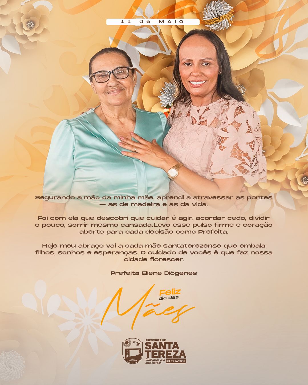 "Segurando a mão da minha mãe, aprendi a atravessar as pontes - as de madeira e as da vida. Foi com ela que descobri que cuidar é agir: acordar cedo, dividir o pouco, sorrir mesmo cansada. Levo esse pulso firme e coração aberto para cada decisão como Prefeita. Hoje meu abraço vai a cada mãe santaterezense que embala filhos, sonhos e esperanças. O cuidado de vocês é que faz nossa cidade florescer."