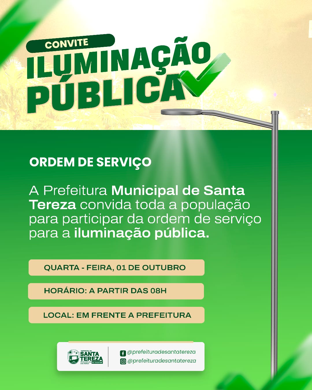 A Prefeitura Municipal de Santa Tereza do Tocantins convida toda a população para participar da solenidade de Ordem de Serviço que marcará o início dos trabalhos de melhoria na Iluminação Pública do município.