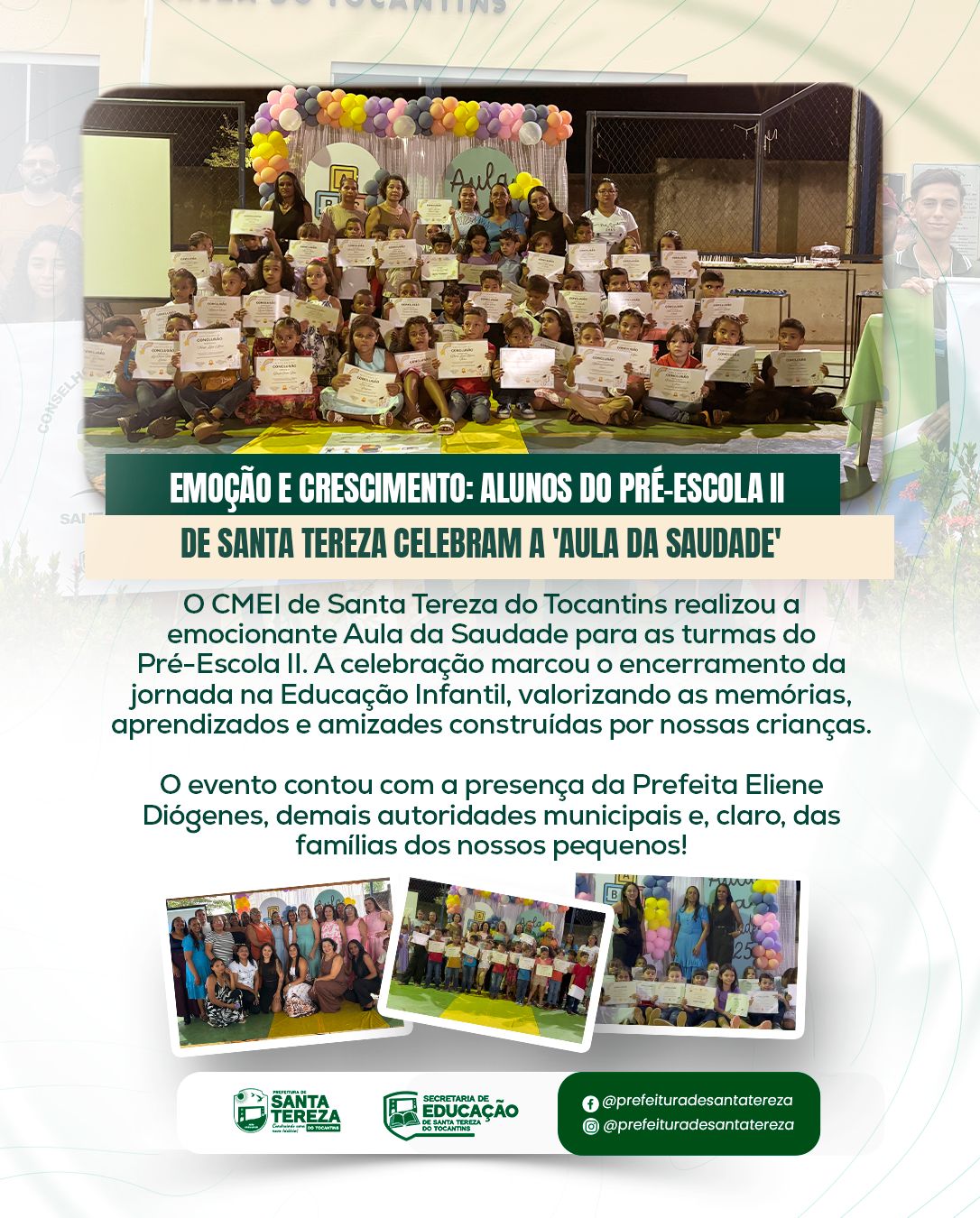O Centro Municipal de Educação Infantil (CMEI) de Santa Tereza viveu um momento de intensa emoção e celebração com a realização da tradicional Aula da Saudade das turmas do Pré-Escola II. A cerimônia marcou o encerramento da jornada das crianças na Educação Infantil, um período fundamental de descobertas, aprendizado e, acima de tudo, formação de laços afetivos profundos.