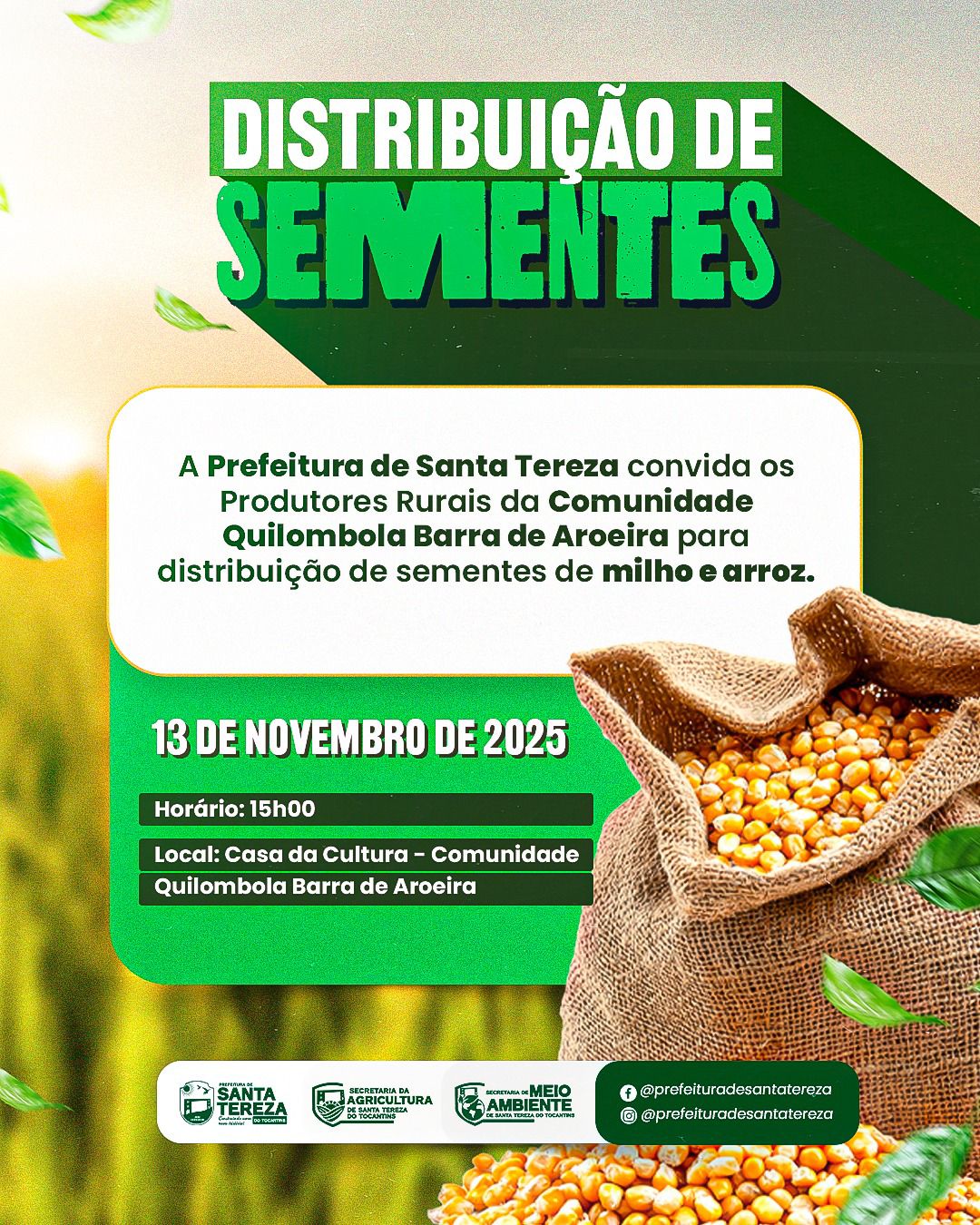 A Prefeitura de Santa Tereza do Tocantins demonstra seu apoio contínuo à agricultura familiar e às comunidades tradicionais com a realização de um importante evento de Distribuição de Sementes. A ação é destinada aos Produtores Rurais da Comunidade Quilombola Barra de Aroeira.