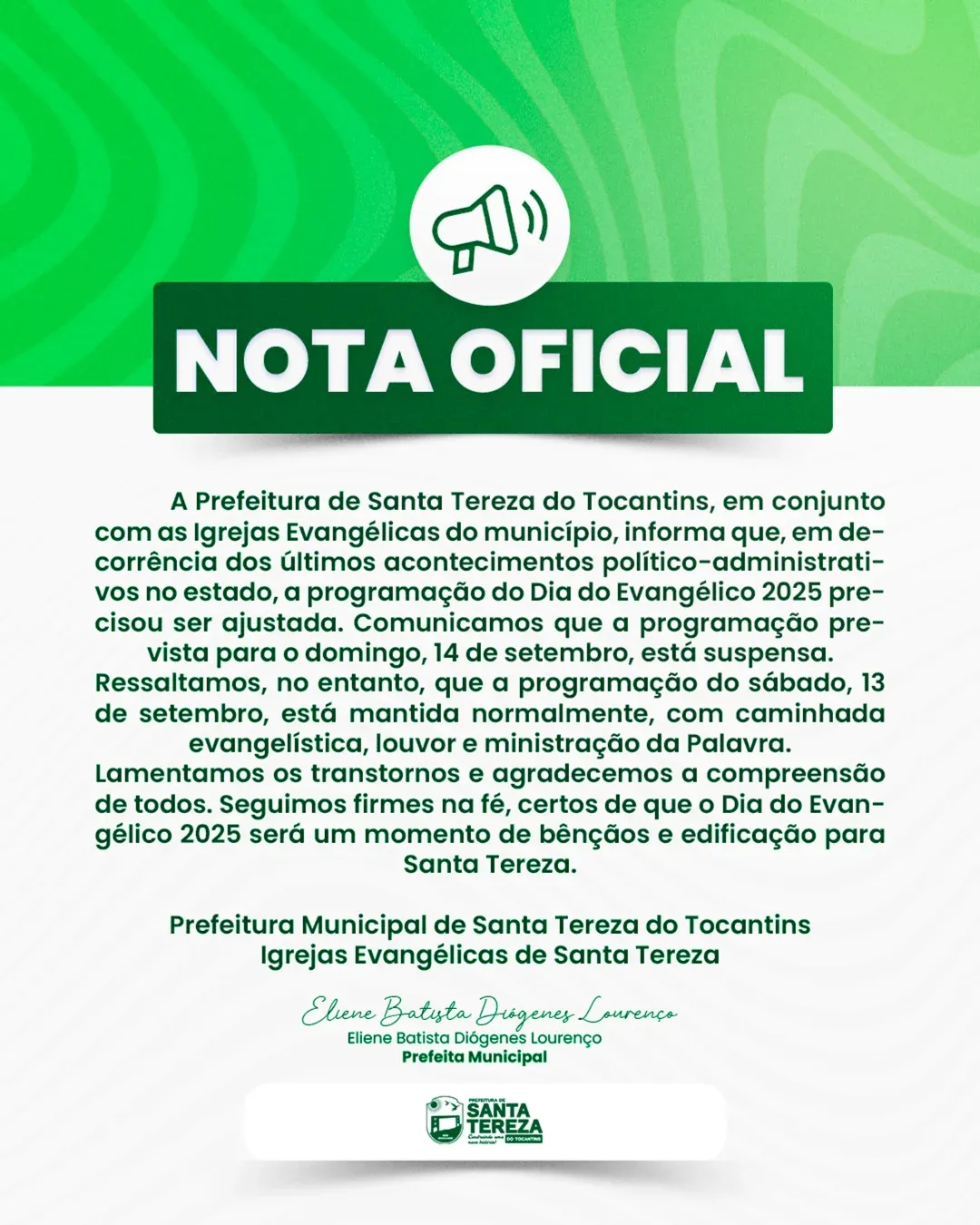 A Prefeitura Municipal de Santa Tereza do Tocantins, em parceria com as Igrejas Evangélicas do município, divulgou uma nota oficial nesta semana informando alterações na programação do Dia do Evangélico 2025. Devido a recentes acontecimentos político-administrativos no estado, as atividades previstas para o domingo, 14 de setembro, foram suspensas.